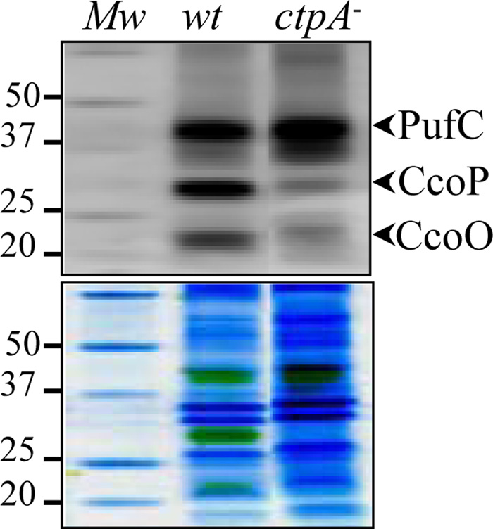 SDS-PAGE and 3,3,5,5-tetramethylbenzidine (TMBZ) analyses of c-type cytochromes. Comparable amounts of membrane proteins (120 g) from wt and the ctpA mutant grown under microaerobic conditions were loaded on a 12% SDS-PAGE gel. The gel was first stained for covalently bound heme with 3,3,5,5-tetramethylbenzidine (upper) then with Coomassie Blue (lower). The band at 43 kDa present in the WT and in the mutant corresponds to the reaction center-attached tetraheme cytochrome c (PufC). Both CcoP and CcoO are drastically reduced in the ctpA membranes compared with the wild type. These TMBZ bands turn green in the Coomassie Blue-stained gel (B).
